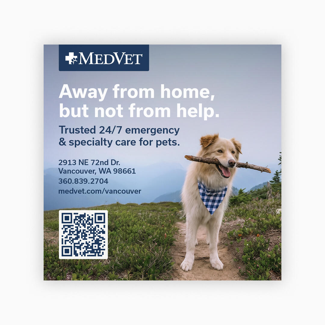 Print advertisement for Visit Vancouver tourism magazine targeting travelers to the Pacific Northwest. The brief required an active dog in an outdoor hiking setting in the Pacific Northwest with a stick in its mouth; a specific combination that didn't exist in stock photography.Using Adobe Firefly, I generated the stick element, enhanced the dog's expression for energy and approachability, and replaced the existing bandana with MedVet's brand colors. The final image was color-corrected for print production and integrated into a 4.625" x 4.625" square layout in Adobe Illustrator with clear hierarchy emphasizing emergency care accessibility for travelers.Role: Design, AI-assisted image generation, print production