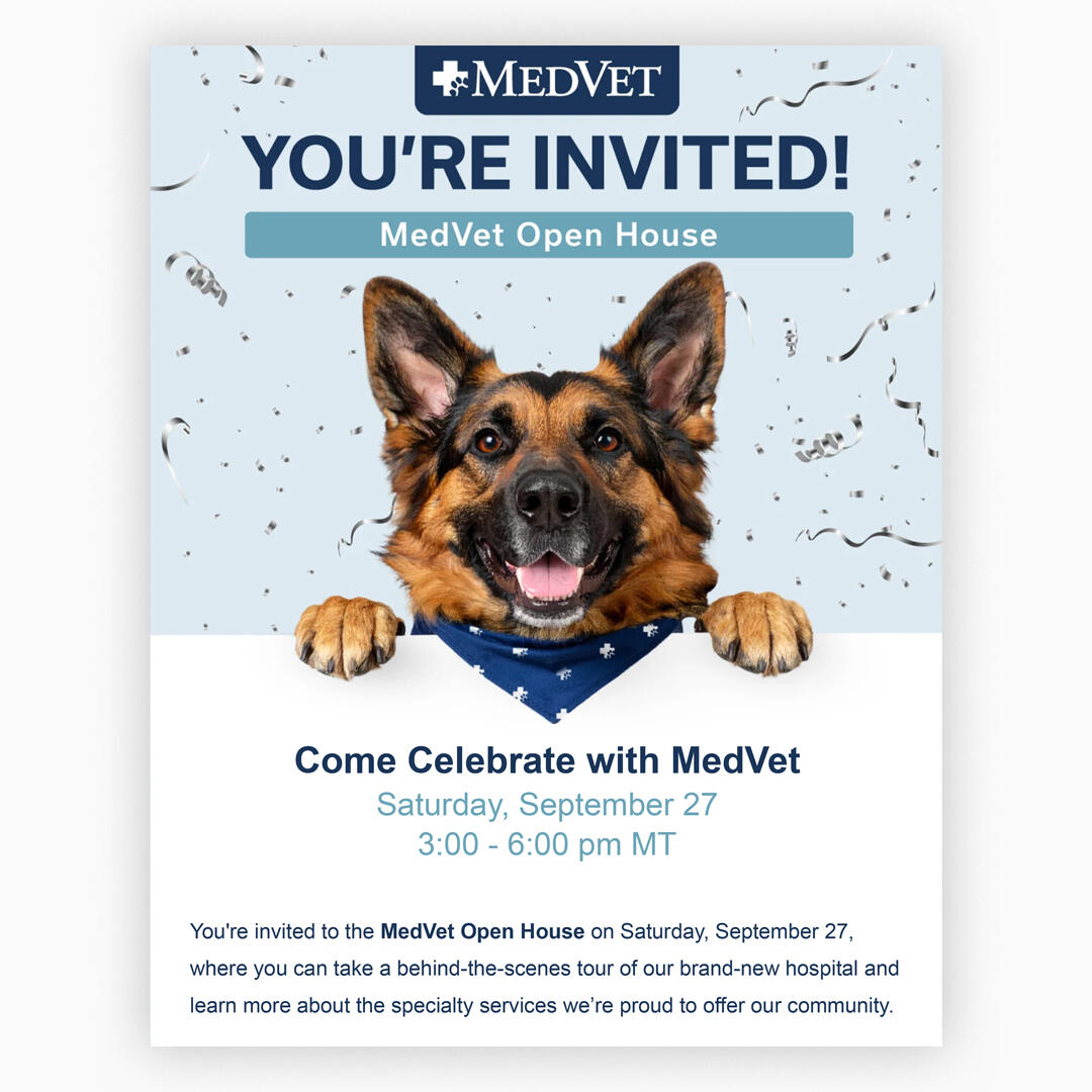 Developed visual identity for new 21,000 sq. ft. emergency and specialty hospital opening in Scottsdale, Arizona. The campaign needed to convey celebration and community welcome across multiple touchpoints while maintaining MedVet's professional healthcare brand standards.Created custom AI-generated hero imagery featuring a German Shepherd in a celebration pose with branded elements; a visual that didn't exist in stock photography. The asset was deployed across email announcements, print flyers, and social media, creating a cohesive campaign identity for the grand opening event.For alternative collateral, I composited real staff photography into an AI-generated hospital environment with precise brand color control, giving the team flexibility to choose between the custom celebration dog or authentic staff representation depending on channel and audience.